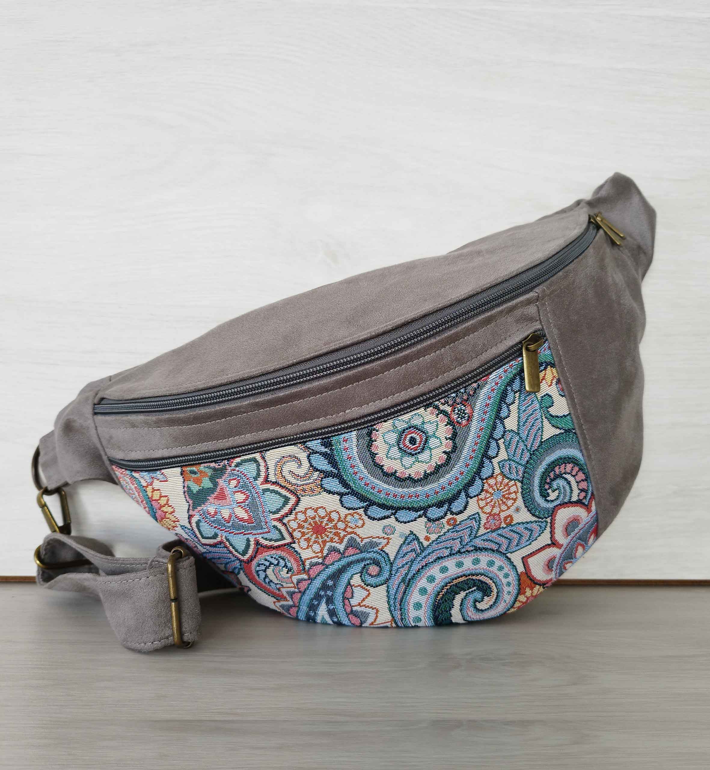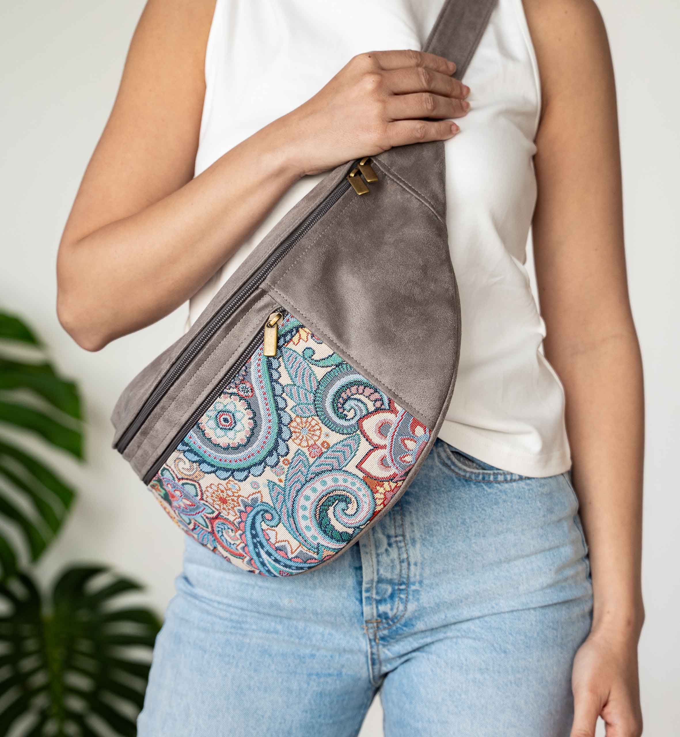Confeccionado en tejido gobelino de alta calidad con motivos de cachemira y ante vegano aterciopelado en tono topo claro, combina fácilmente con cualquier conjunto.