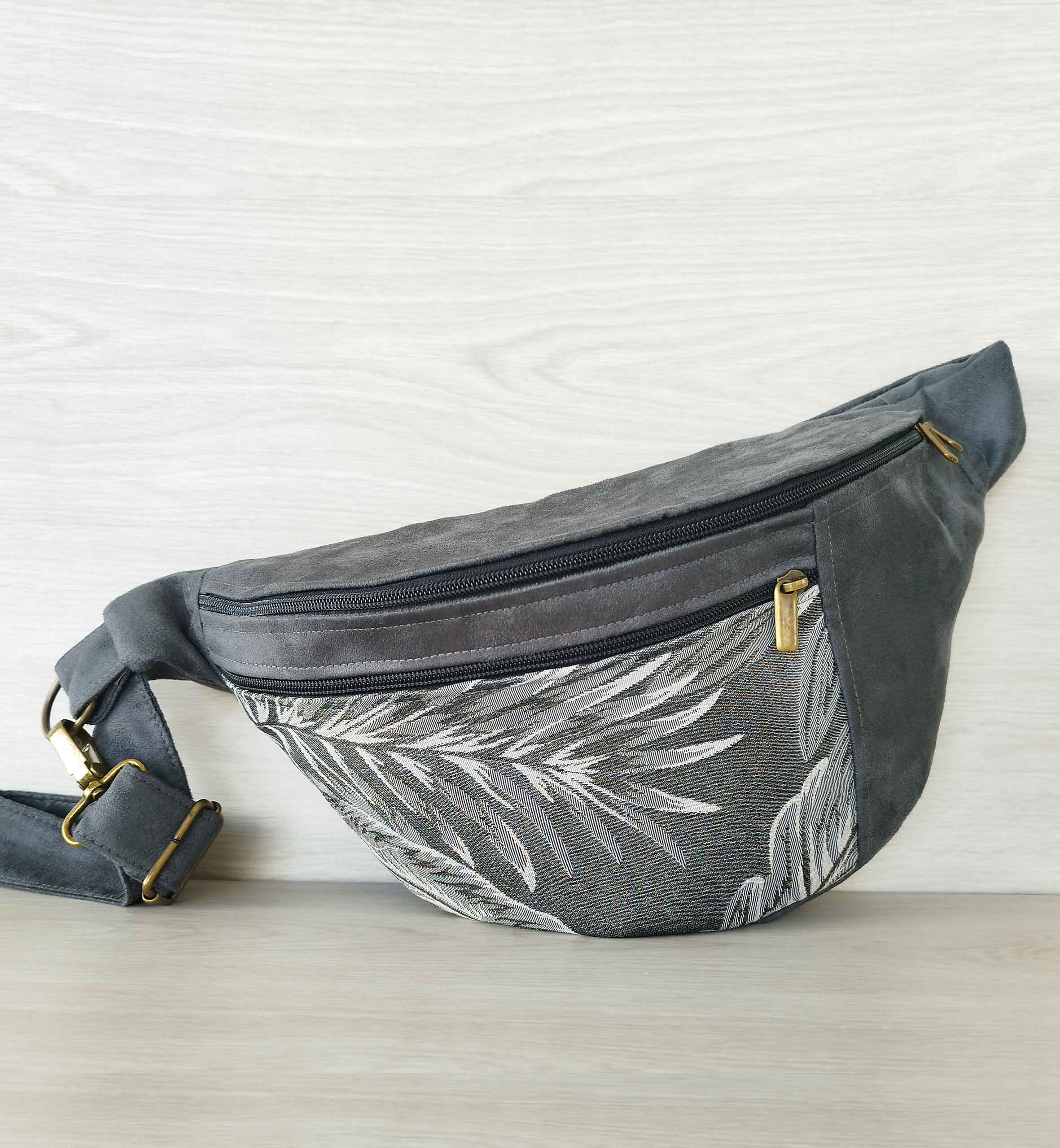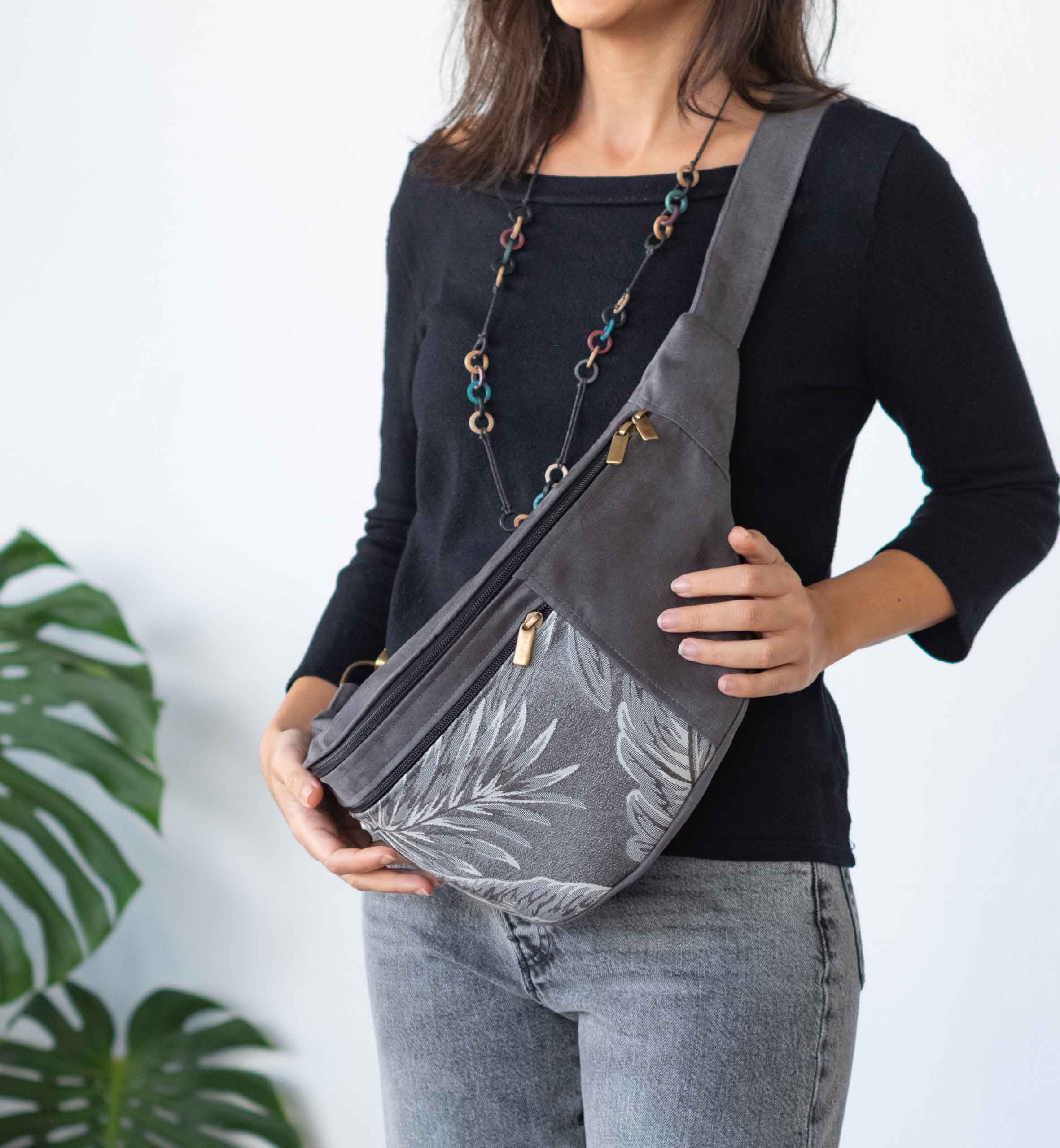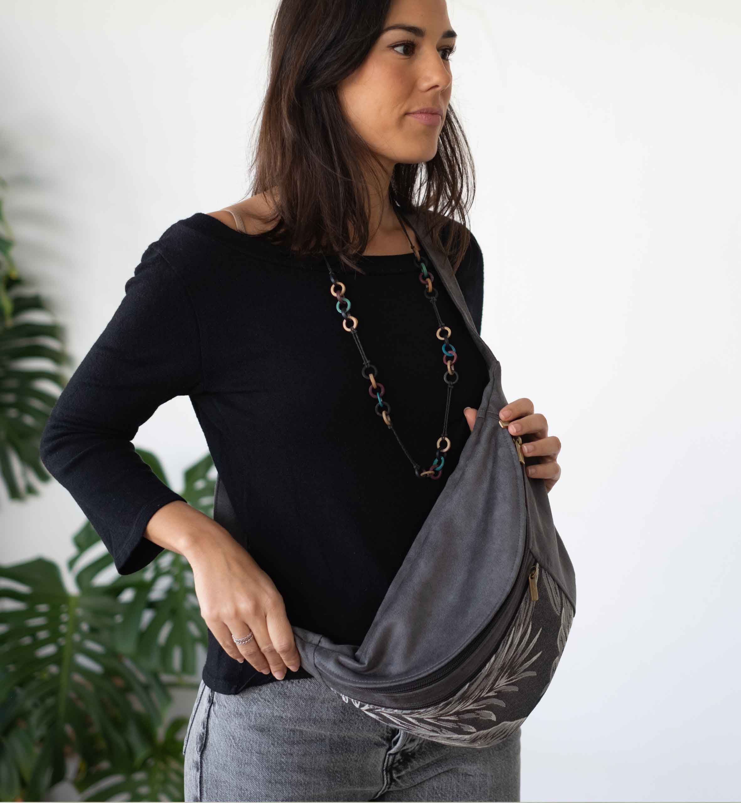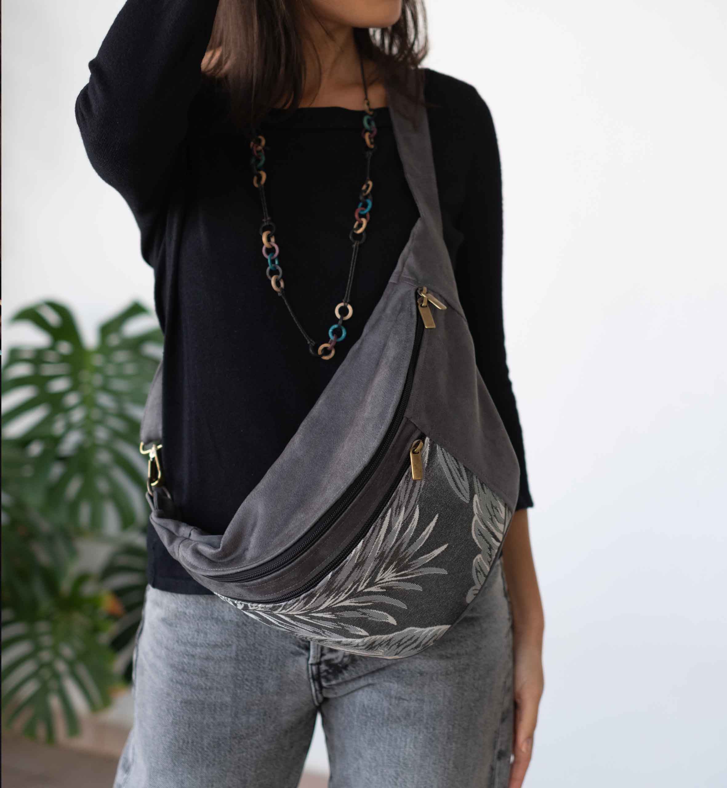 Una riñonera oversize con carácter propio: ligera, resistente y con un diseño que combina ante vegano gris oscuro, suave y aterciopelado, con un textil estampado de hojas blancas sobre fondo negro. Un contraste elegante y atemporal que encaja en cualquier estilo.