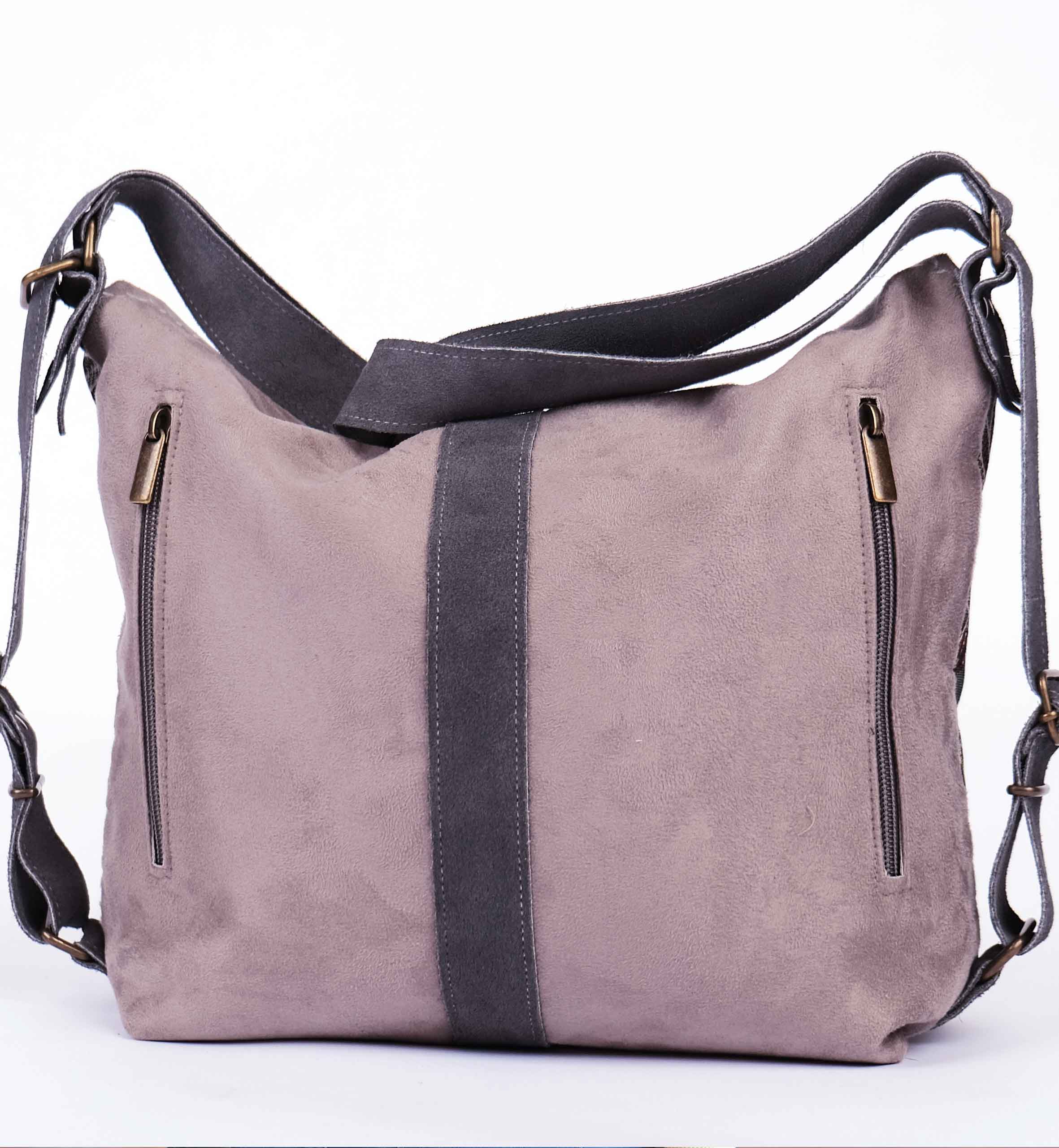Bolso hobo ligero y original, fácilmente convertible en mochila, con un delicado mandala de inspiración azteca tribal. Está acompañado de suave y aterciopelado ante vegano en gris, que le da un toque elegante y versátil.