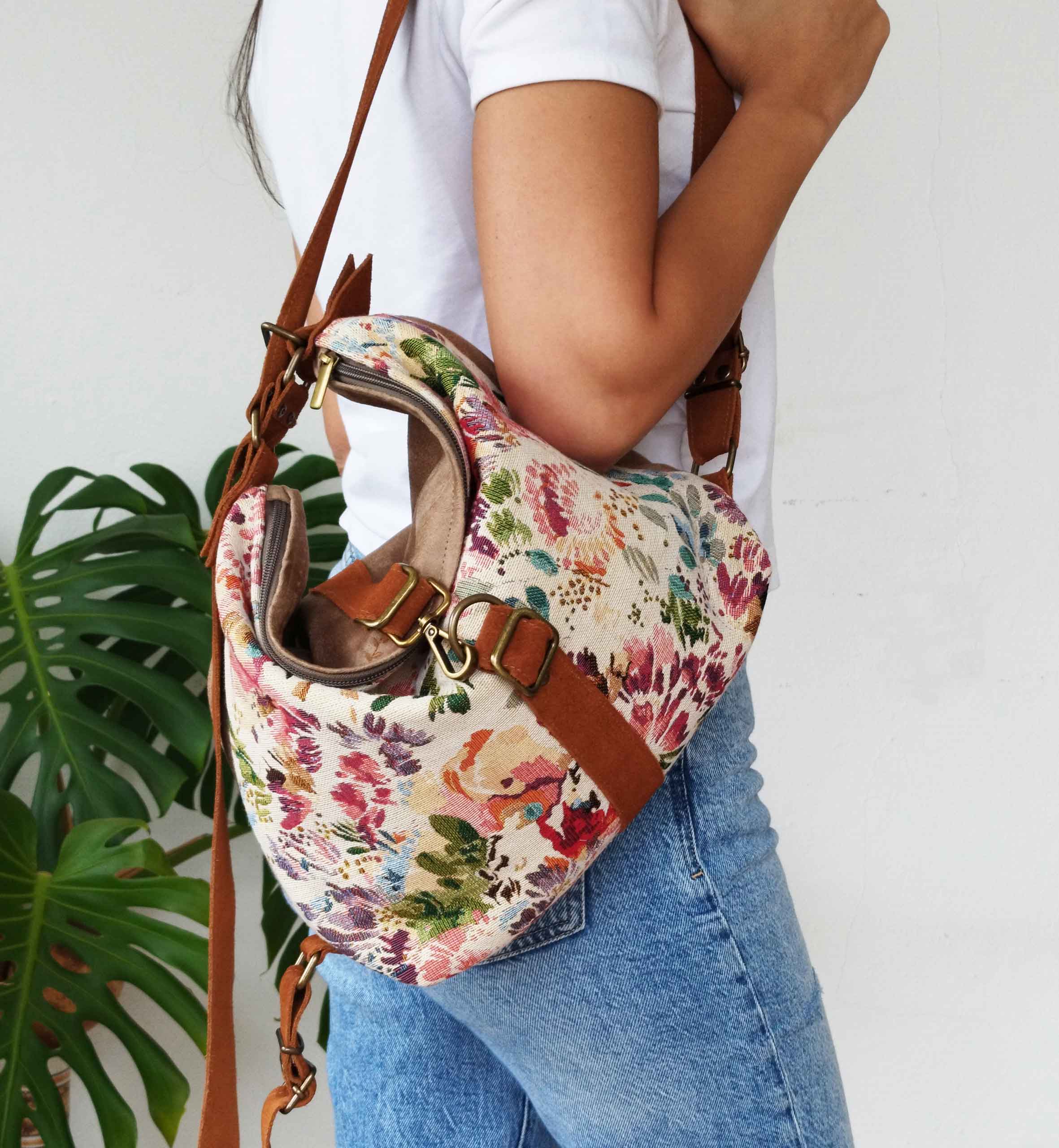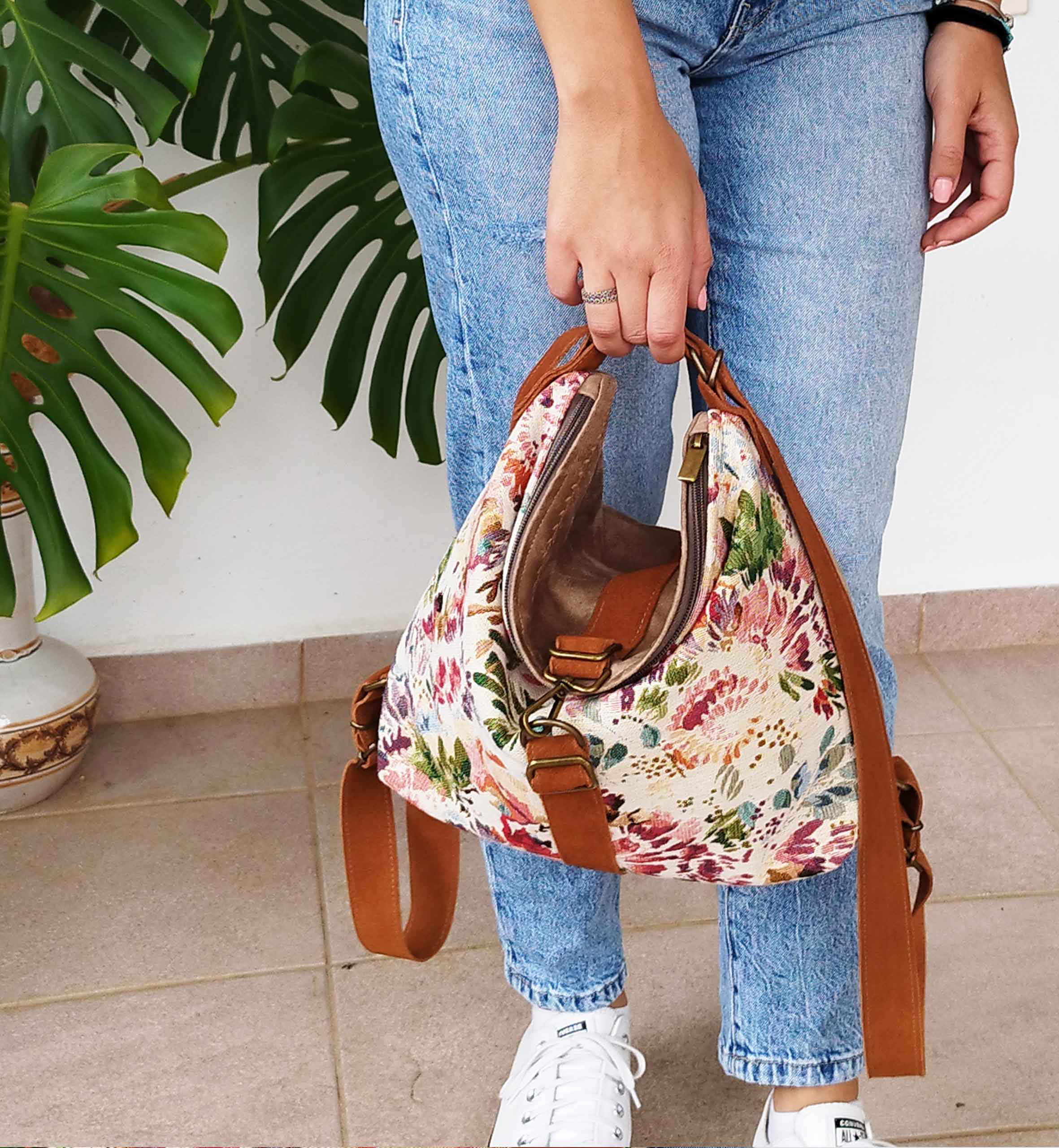 Ligera, flexible y con un encanto único: esta mochila convertible está confeccionada en gobelino con un estampado floral lleno de color, inspirado en las pinceladas impresionistas.