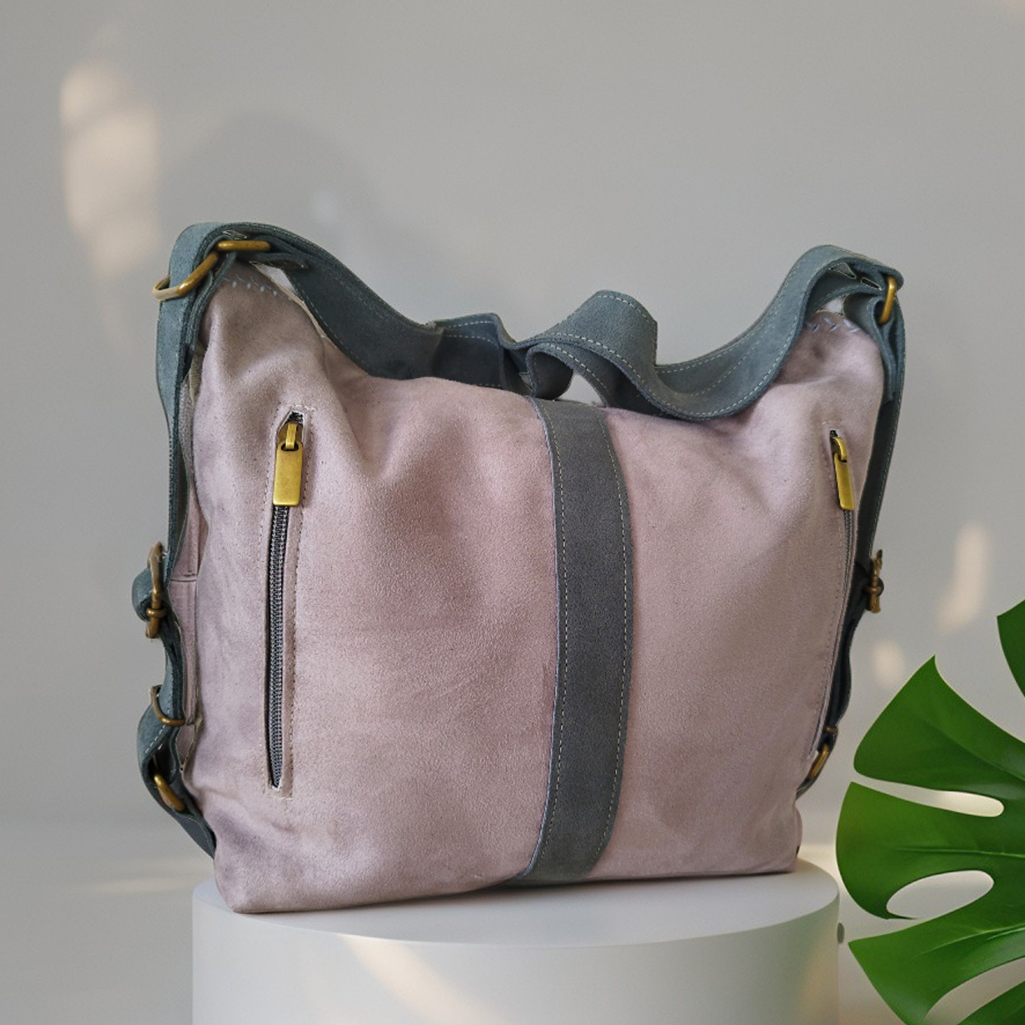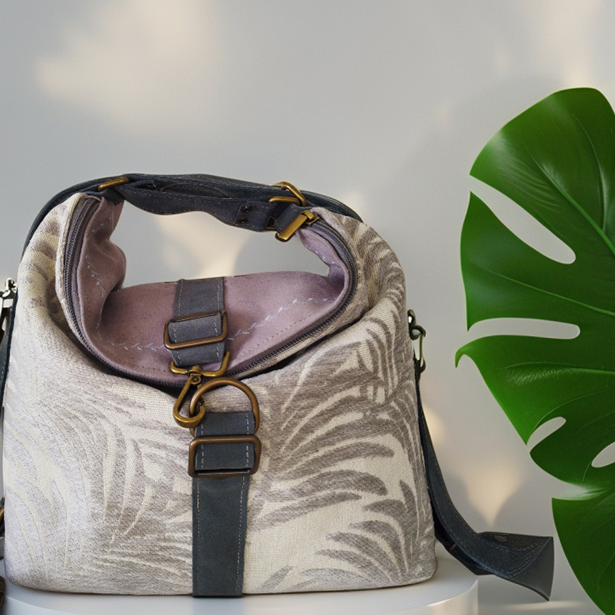 Bolso convertible en mochila con hojas grises