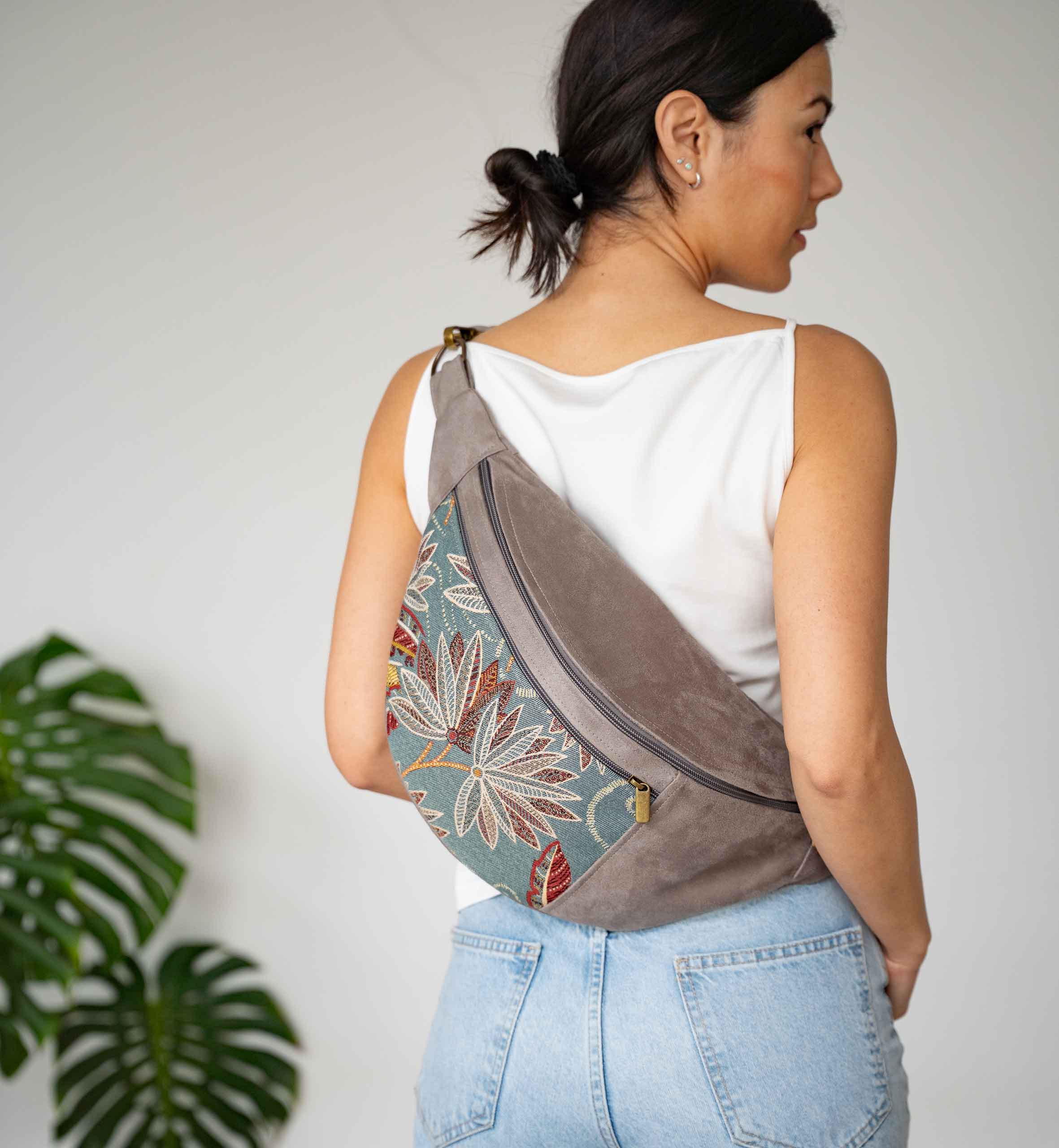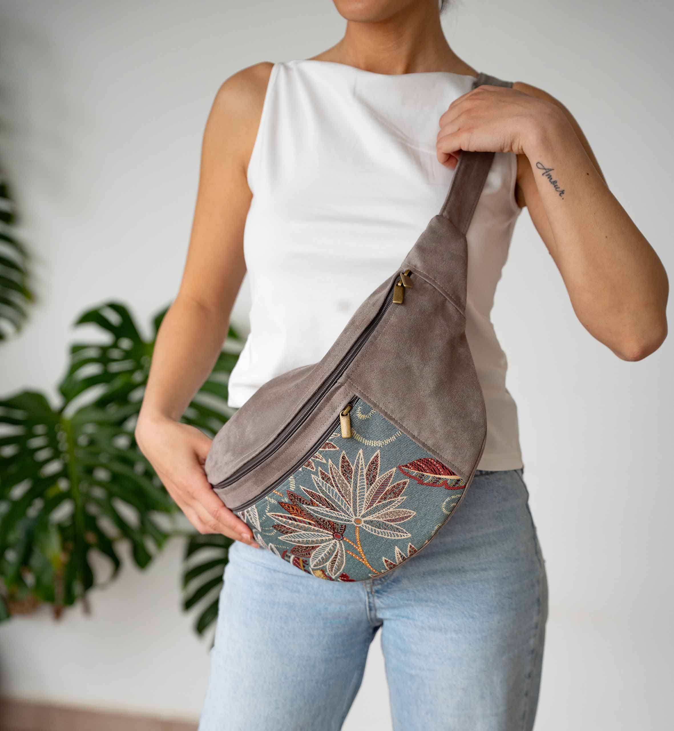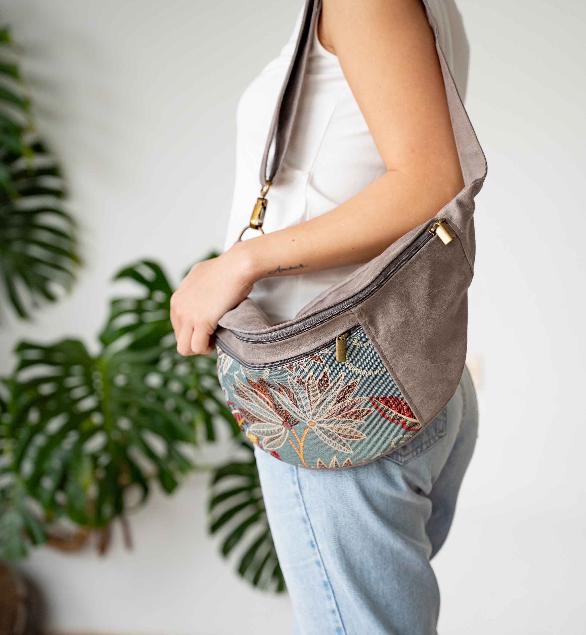 Una pieza original y versátil, pensada para mujeres que buscan comodidad sin renunciar al estilo. Esta riñonera de gran tamaño está hecha a mano, cuidando cada detalle, con un tejido exclusivo estampado con motivos florales japoneses en tonos azul claro y combinada con ante vegano gris oscuro, suave y resistente.