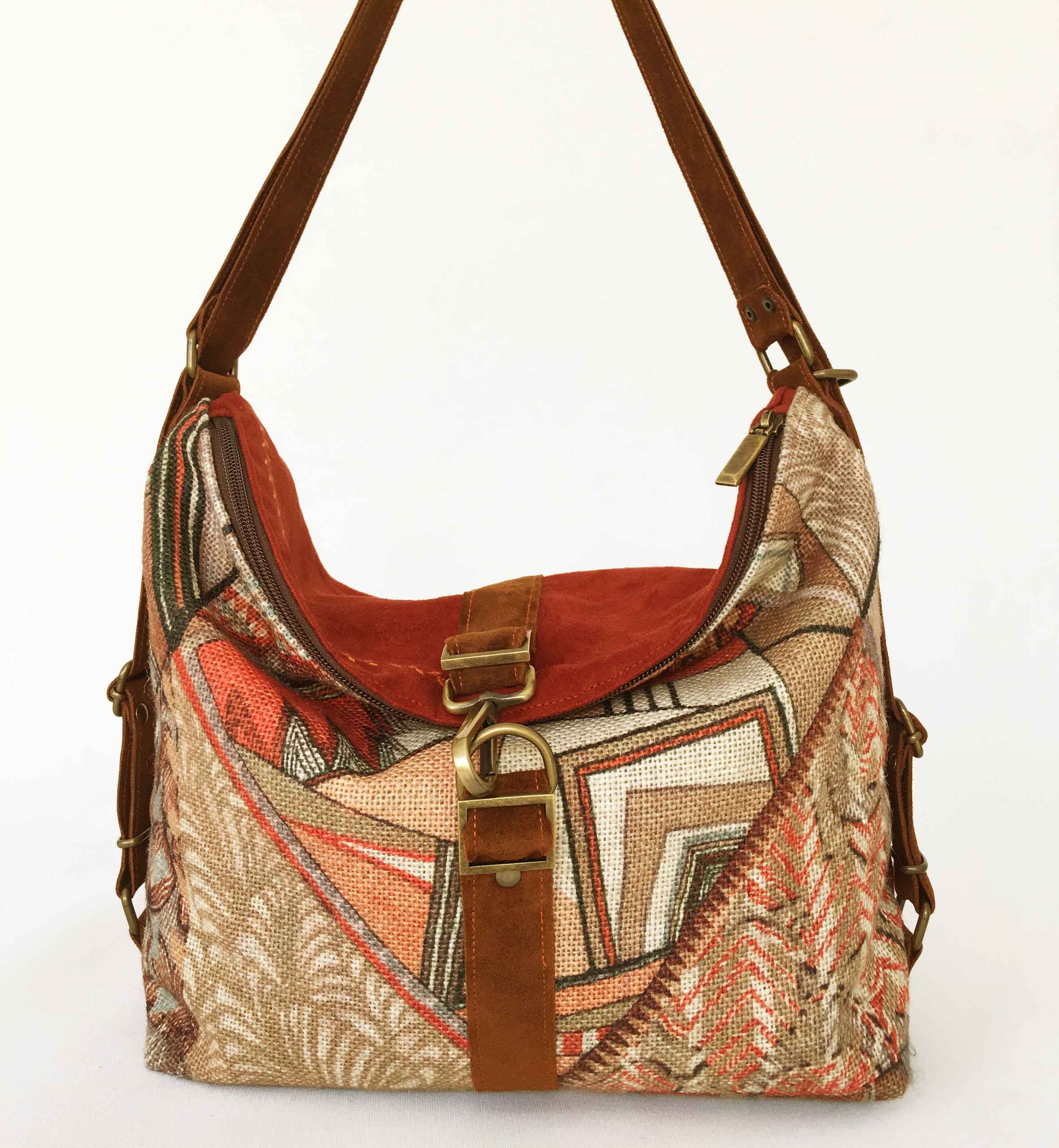 Bolso de arpillera estampada, convertible fácilmente en mochila. Bolso hobo holgado